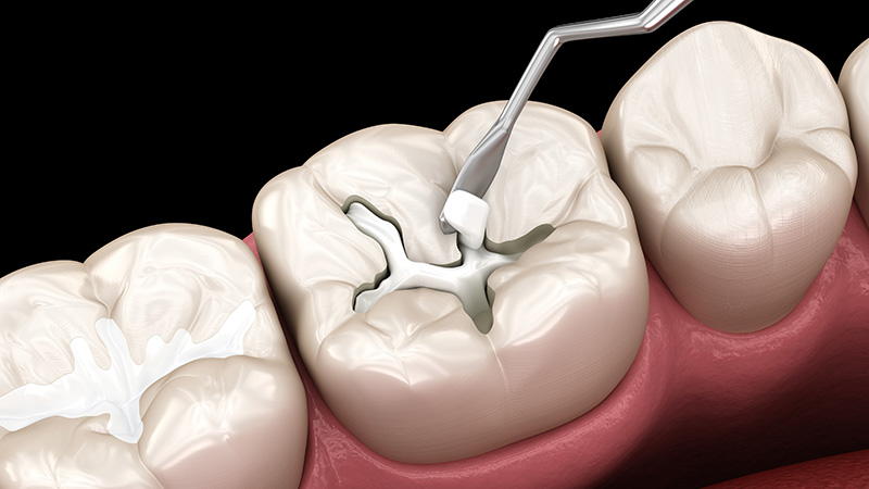 神経に達していないむし歯に対して用いられる部分的な白い合成樹脂の詰め物のことで、インレーよりも強度が弱いため、より小さな範囲に適応することが多いです。その場で詰めていくので治療は当日に終わります。