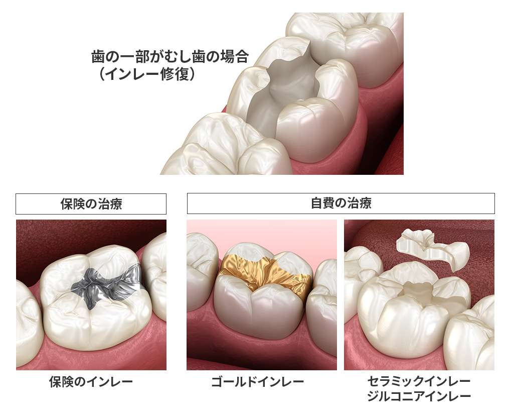 神経に達しておらず広範囲に及ばない奥歯のむし歯に対して用いられる部分的な被せ物のことです。むし歯になっているところを削り、形を整えて型を取り、次の来院時にセットします。