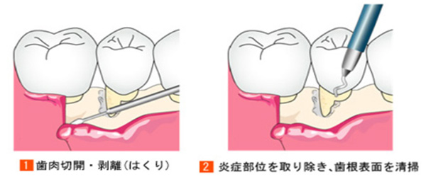 歯石除去やルートプレーニングにより、原因となる細菌や歯石を取り除きます。 - 外科的治療