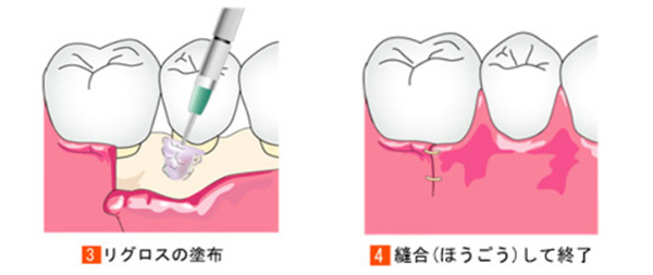 歯石などの汚れを取り除き、失われた組織を誘導する薬剤を用いて、骨等の組織を再生させる治療法です。