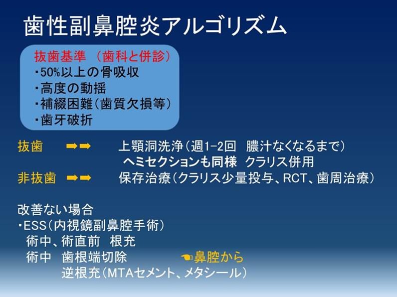 歯性上顎洞炎は歯科および耳鼻咽喉科でも治療が行われますが、歯科、耳鼻科双方の知識、技術が必要であり治療に難渋する場合が多いです。