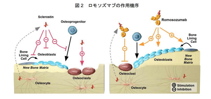 骨免疫学の成果から作られた最新の注射薬で1か月に1回12か月間に限って注射ができます。骨吸収を防ぐとともに骨形成を促す両面の働きがあります。