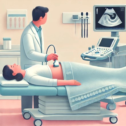 - ベッドに仰向けに寝てお腹を出して、ゼリーのついたプローブを当てて検査します