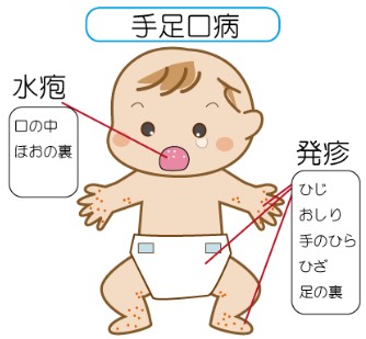 口の中に口内炎、手足に水疱性の発疹、背中からおしりにかけての水疱性の発疹がでます。発熱のあるお子さんもおりますが、あまり高熱にならないことが多く、1~2日で下がります。まれに、髄膜炎、脳炎などの合併症、心筋炎、弛緩性麻痺などを起こすことがあります。また3~4週たってから手足の爪が剥がれたり、むけたりすることがあります。